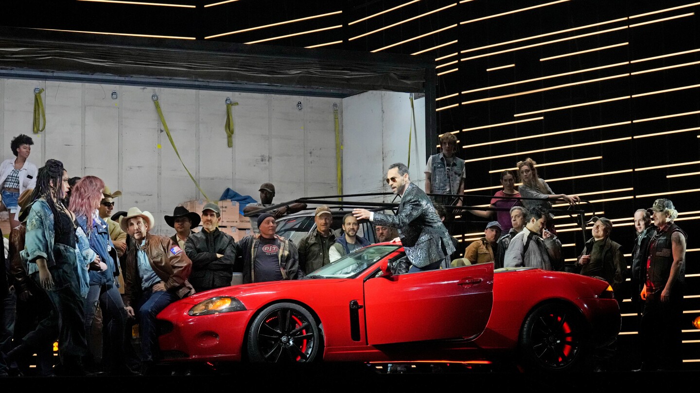 However, in what the Met describes as a cost-cutting measure, the company drastically altered this key scene for the production’s current run. The Jaguar and two trucks were eliminated entirely. Instead, Escamillo now walks in with his followers, some pushing a motorcycle, while one stationary pickup truck remains on stage throughout the act.