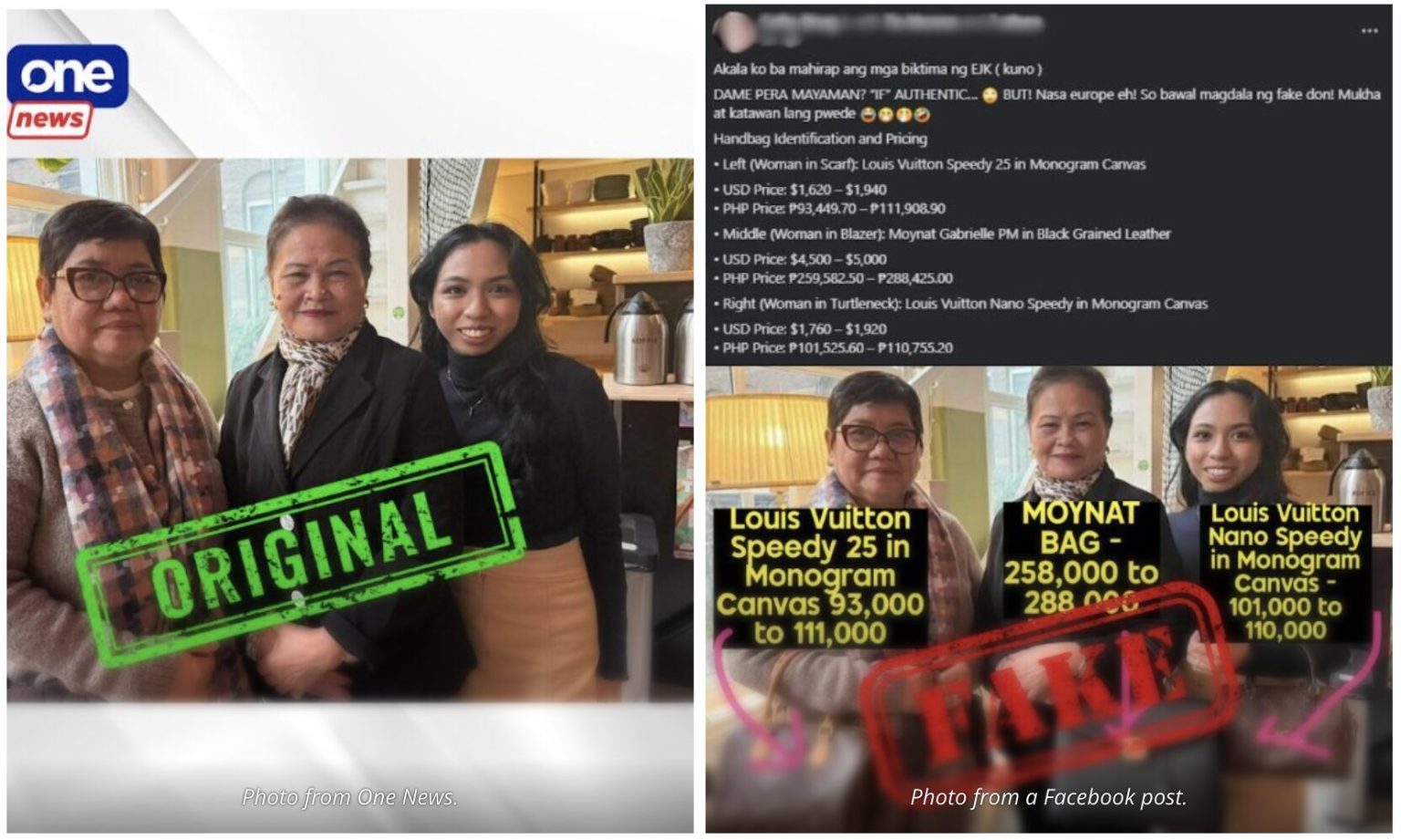 Pro-Duterte vlogger Cathy Binag recently posted an altered image showing victims’ family members supposedly flaunting expensive handbags while in The Hague, Netherlands. The doctored photograph, which received over 100,000 engagements before being removed, was quickly flagged as fake by One News, which had published the original, unaltered image.