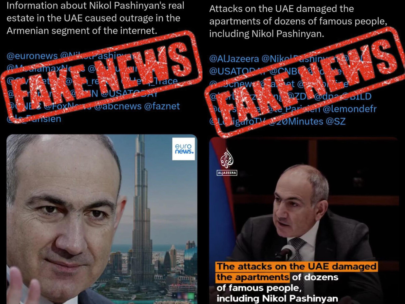 According to Nazeli Baghdasaryan, Pashinyan’s spokesperson, the fraudulent posts on X (formerly Twitter) feature manipulated images with Al Jazeera and Euronews logos alongside the Prime Minister’s photograph. These posts falsely claim that Pashinyan owns expensive real estate in the United Arab Emirates that was allegedly damaged during recent missile strikes in Dubai.