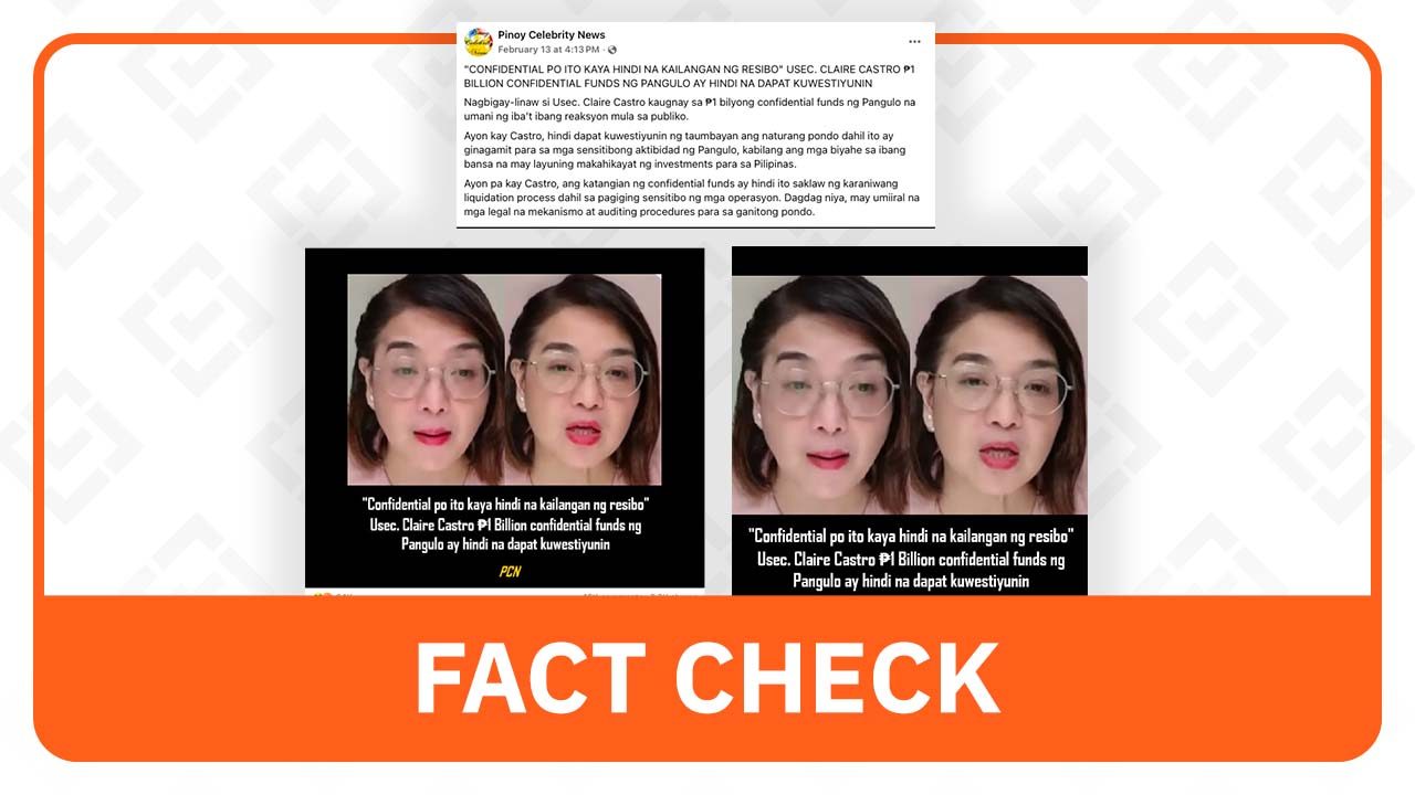 The fabricated quote card from “Pinoy Celebrity News” features Presidential Communications Office Undersecretary Claire Castro alongside an alleged statement claiming, “Confidential fund po ito kaya hindi kailangan ng resibo” (These are confidential funds and they don’t require receipts).