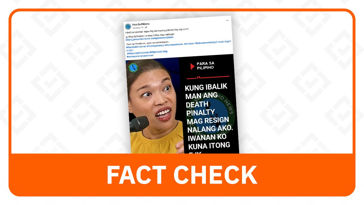 The fabricated quote card incorrectly labeled Conti as “Rep. Conti,” falsely implying she holds a position in the House of Representatives. The card attributed the following statement to her: “Kung ibalik man ang death penalty mag resign nalang ako. Iwanan ko [muna] itong EJK [extrajudicial killings].” This translates to: “If the death penalty is reinstated, I will resign. I will leave this EJK [case] for now.”