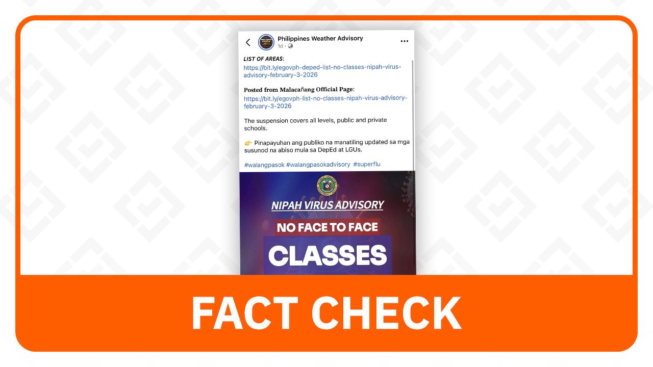 “DepEd Announcement: No classes due to the Nipah virus outbreak, classes and work are suspended in selected areas as declared by local government units on Monday, February 3, 2026,” read one of the posts, which included alleged links to areas affected by the suspension and an advisory supposedly issued by Malacañang.