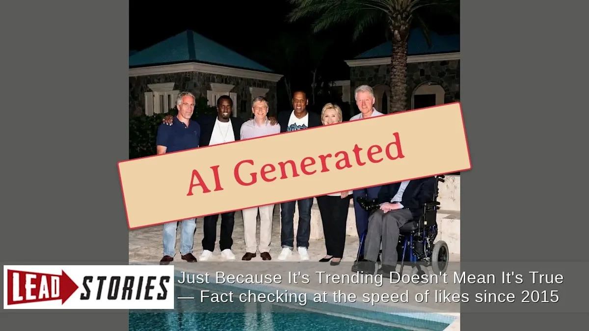 A supposedly “real” photograph from 2006 showing Jeffrey Epstein alongside Bill and Hillary Clinton, Sean “Diddy” Combs, Bill Gates, Jay-Z, and Stephen Hawking by a swimming pool has been circulating on social media platforms, but fact-checkers have confirmed the image is entirely fabricated.