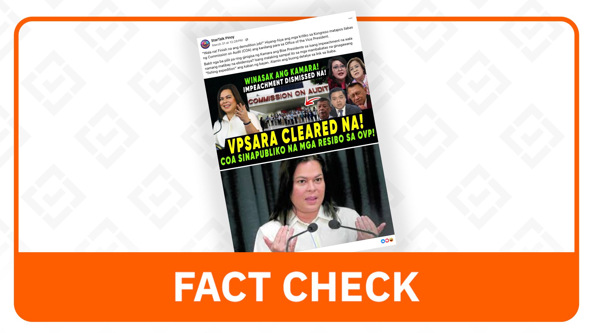 The claim that the Commission on Audit (COA) has cleared Vice President Sara Duterte of alleged fund misuse and that impeachment complaints against her have been dismissed is false, according to fact-checkers.