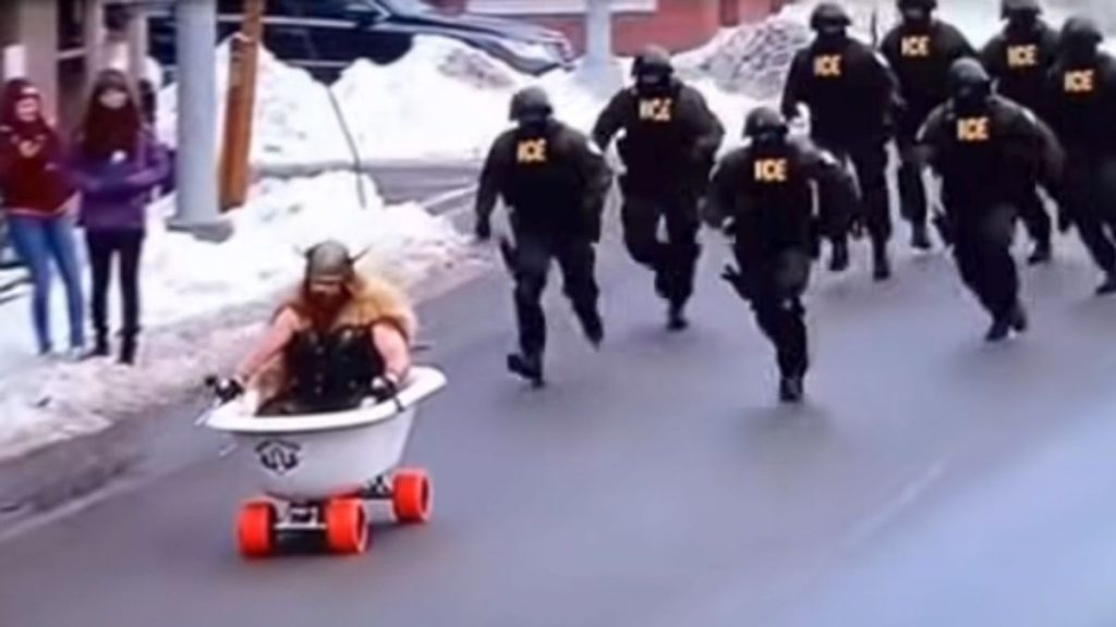 Technical inconsistencies further exposed the fabrication. The Viking’s bathtub showed no realistic means of acceleration, steering, or braking. The supposed ICE agents wore non-standard uniforms, and the chyron featured a fictional TV network named “POVART” with the implausible time stamp “4:06 PHM” instead of “4:06 p.m.” Some agents mysteriously gained batons in their hands by the end of the clip that weren’t visible at the beginning.