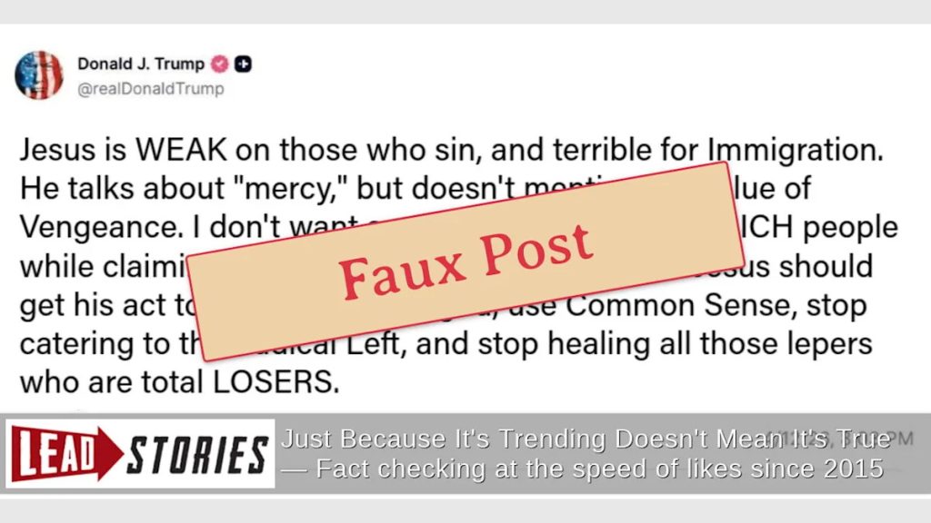 A social media post allegedly showing former President Donald Trump calling Jesus “WEAK on those who sin, and terrible for Immigration” has been confirmed as fabricated content. The post, which gained traction across multiple platforms, never appeared on Trump’s official Truth Social account but was instead created as satirical content by comedian Matt Ruby.