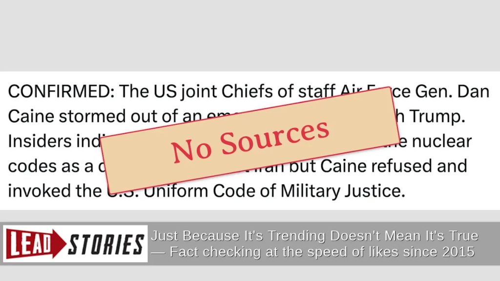 The unfounded allegation first appeared on X (formerly Twitter) on April 19, 2026, when user @JaokooMoses posted: “CONFIRMED: The US joint Chiefs of staff Air Force Gen. Dan Caine stormed out of an emergency meeting with Trump. Insiders indicate that Trump wanted to invoke the nuclear codes as a deterrence against Iran but Caine refused and invoked the U.S. Uniform Code of Military Justice.”