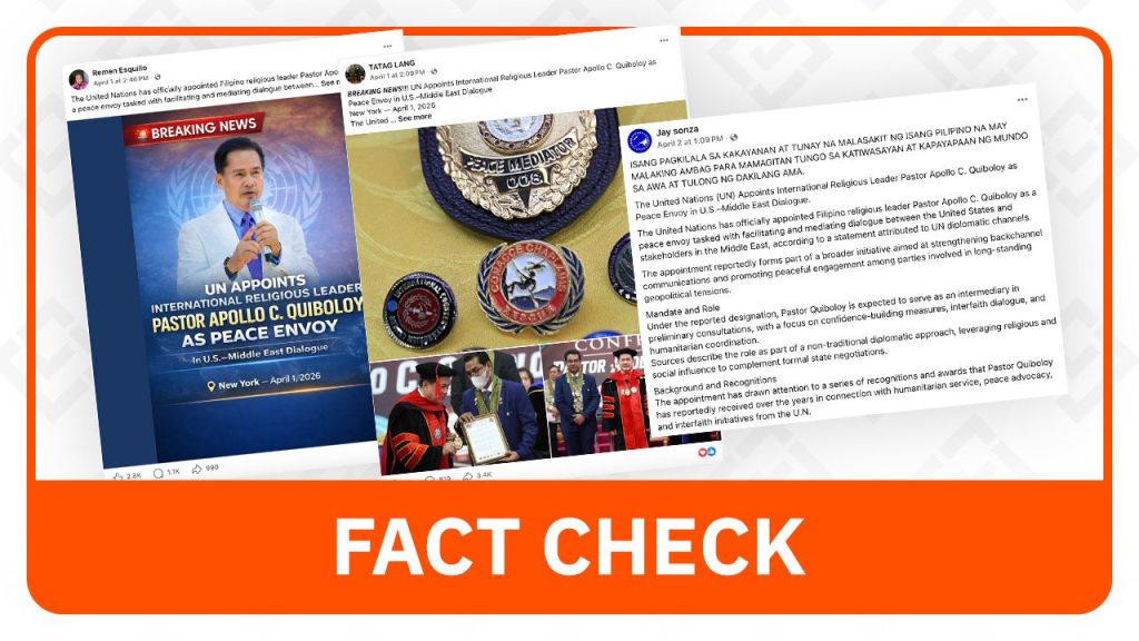 Several posts feature identical or similar captions stating: “The United Nations (UN) Appoints International Religious Leader Pastor Apollo C. Quiboloy as Peace Envoy in U.S.–Middle East Dialogue.” Another variation of the claim, which received approximately 2,800 reactions, goes further by specifying the appointment supposedly took place on April 1, 2026, in New York.