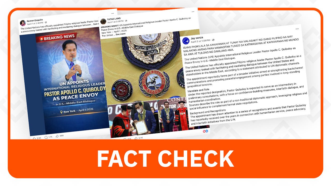 Multiple false claims have been spreading on social media alleging that Filipino religious leader Pastor Apollo Quiboloy has been appointed as a peace envoy by the United Nations to mediate in U.S.-Middle East dialogues. These fabricated reports come amid ongoing tensions between Israel, the United States, and Iran.