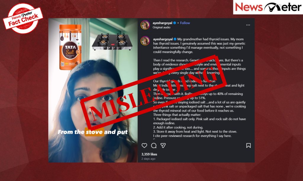 A viral Instagram video claiming improper salt storage contributes to thyroid problems among Indian women has been deemed misleading by health experts and chemists. The video, posted by creator Ayesh Raje Goyal, has sparked concern by suggesting that storing salt containers near stoves destroys essential iodine needed for thyroid function.