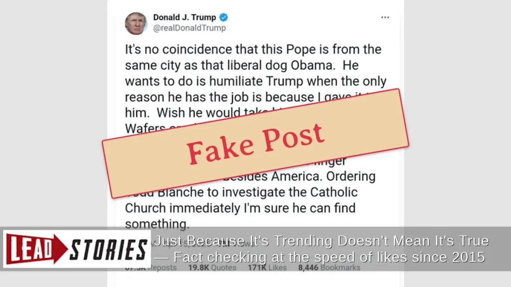 In the fake post, Trump allegedly wrote: “It’s no coincidence that this Pope is from the same city as that liberal dog Obama. He wants to do is humiliate Trump when the only reason he has the job is because I gave it to him.” The falsified message continues with inflammatory rhetoric about Catholic communion wafers and claims that Trump ordered “Todd Blanche to investigate the Catholic Church immediately.”