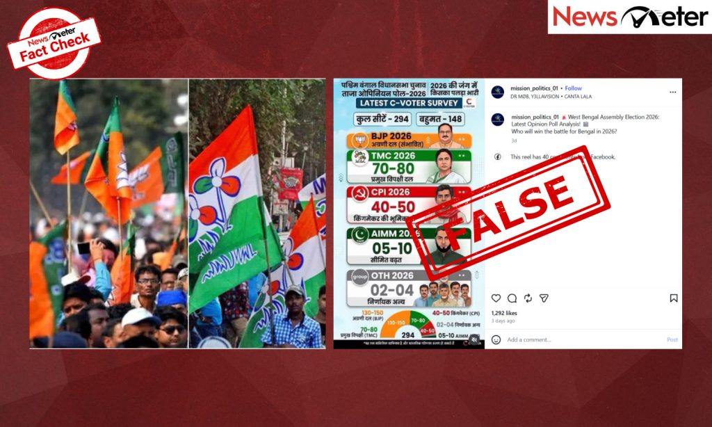 The Instagram reel, which has garnered over one million views, features a graphic titled “LATEST C VOTER SURVEY” suggesting that BJP would secure between 130-150 seats in the 294-member West Bengal Assembly. According to the fabricated graphic, the ruling Trinamool Congress (TMC) would be reduced to 70-80 seats, with Communist Party of India securing 40-50 seats, AIMIM 5-10 seats, and other parties claiming 2-4 seats.