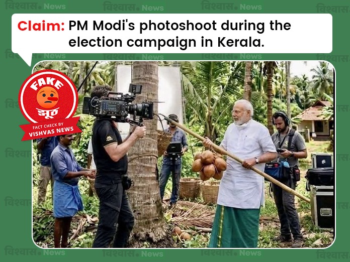 The image, which depicts PM Modi holding coconuts while surrounded by photographers, went viral on social media platforms with captions suggesting it was taken during his campaign visit for the 2026 Kerala Assembly elections. Facebook user Javed Ahmed shared the image on April 6, claiming it showed the Prime Minister staging a photo opportunity in Kerala.