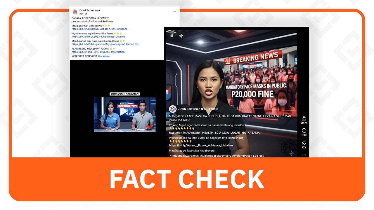 Several popular Facebook posts claiming to represent a television network affiliated with the Department of Social Welfare and Development (DSWD) have generated millions of views with false announcements about government-mandated face mask rules and lockdowns in unspecified areas. One such post amassed 2.4 million views, 26,000 reactions, and 15,000 shares.
