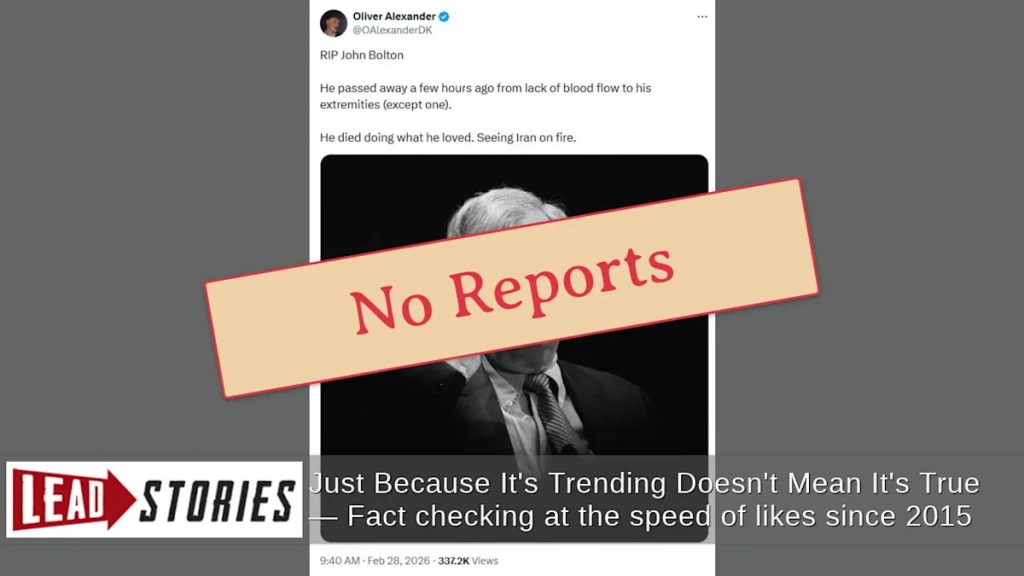 The false report appeared on X (formerly Twitter) on February 28, 2026, stating: “RIP John Bolton. He passed away a few hours ago from lack of blood flow to his extremities (except one). He died doing what he loved. Seeing Iran on fire.” The post was accompanied by an image of Bolton but offered no credible sources or verification.