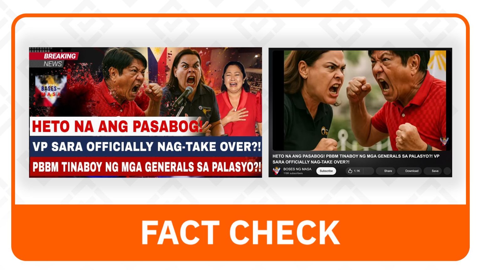 The unfounded allegations emerged from a YouTube video uploaded on October 18, which has garnered over 15,000 views. The video’s thumbnail features manipulated images of Marcos and Duterte appearing to argue, with text claiming: “VP Sara officially took over?! PBBM kicked out by generals from the Palace?!”