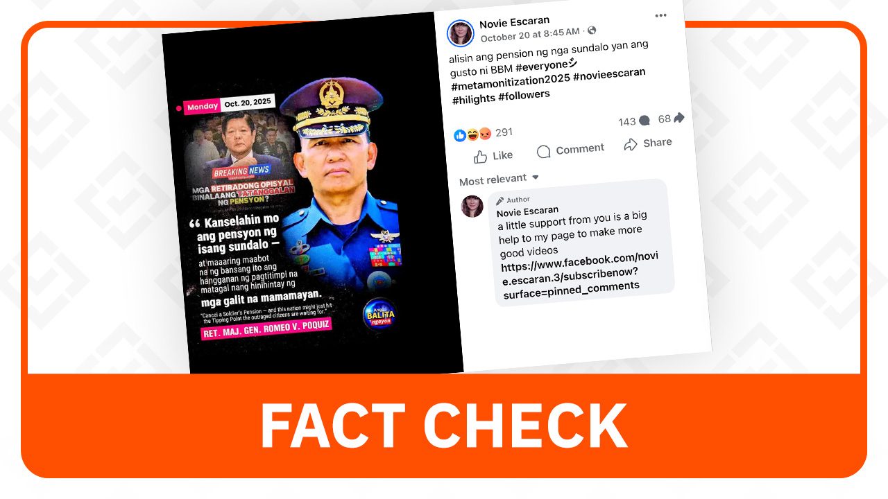 One widely-shared Facebook post from October 20 featured a graphic with Marcos’s photo and text stating, “BREAKING NEWS: Retired officials warned that their pensions would be removed?” The post’s caption claimed, “Remove the pension of soldiers, that’s what [Bongbong Marcos] wants.”