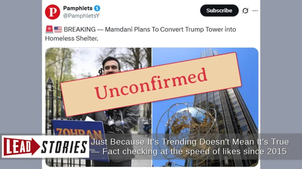 The misinformation first appeared as speculative commentary in a Facebook post dated October 22, 2025, before evolving into what was presented as breaking news on X (formerly Twitter) by November 6. One viral post proclaimed: “🚨🇺🇸 BREAKING — Mamdani Plans To Convert Trump Tower into Homeless Shelter.” However, no credible media organizations have reported such a plan, and neither Mamdani nor his team have made any statements suggesting this course of action.