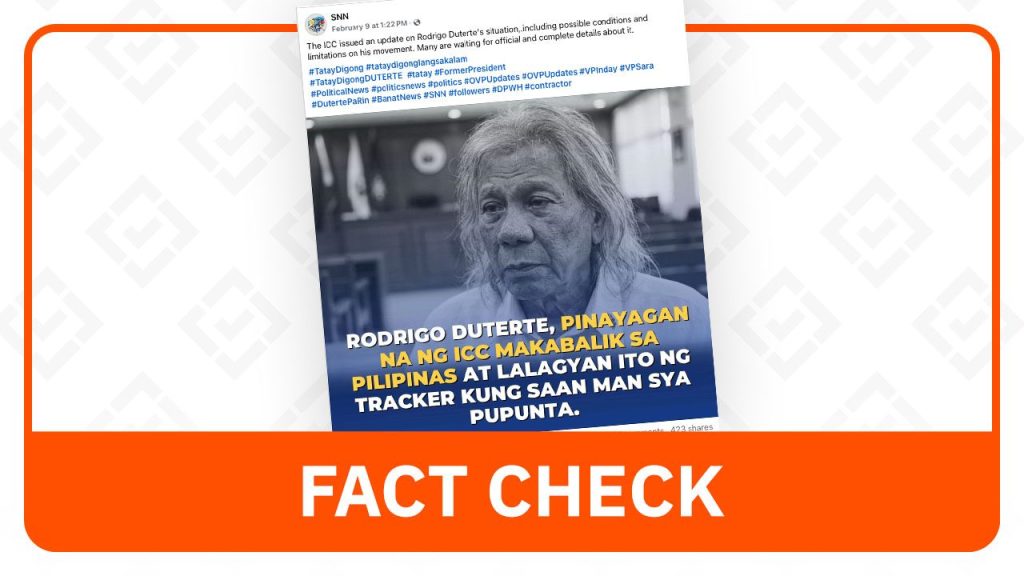 “Rodrigo Duterte, pinayagan na ng ICC makabalik sa Pilipinas at lalagyan ito ng tracker kung saan man sya pupunta,” reads the text on these graphics, claiming the ICC had permitted Duterte to return to the Philippines while equipped with a location tracker. Comments on these posts indicate many users believed the false information, with one commenter expressing relief at the prospect of Duterte’s return.