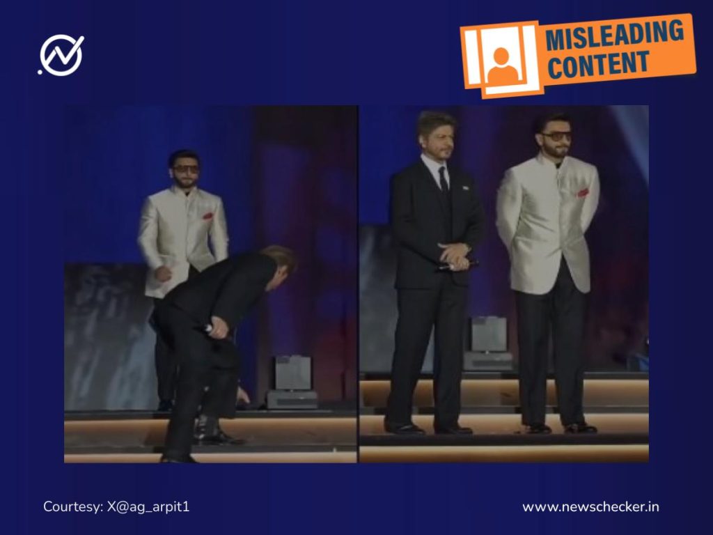 A viral video circulating on social media appears to show Bollywood superstar Shah Rukh Khan bending down to pick up a microphone for fellow actor Ranveer Singh, prompting widespread claims that it reflects Singh’s elevated status in the film industry following the success of his “Dhurandhar” film series. However, fact-checking has revealed that the video is being shared with false context.