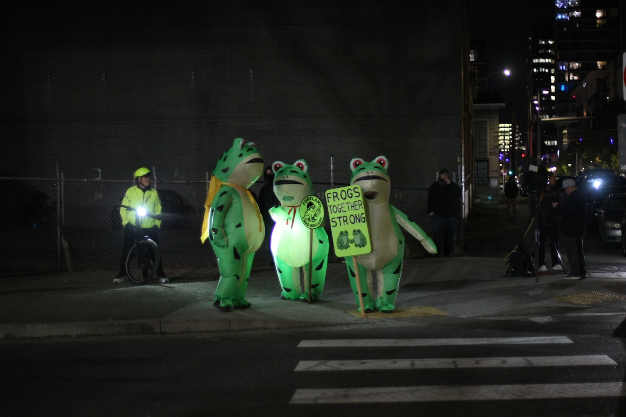 Thursday night’s protest at the ICE building proved relatively uneventful compared to previous demonstrations. About 100 people gathered, including several dressed in animal costumes – frogs, a unicorn, a polar bear, a raccoon, and other animals – creating a surreal atmosphere amid the serious political tensions.