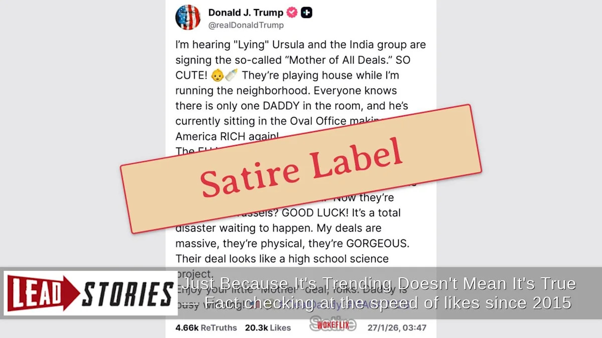 The fabricated post emerged shortly after European Commission President Ursula von der Leyen and Indian Prime Minister Narendra Modi announced what they both called the “mother of all deals” – a significant trade agreement between the EU and India on January 27, 2026. This landmark agreement aims to gradually eliminate tariffs on various categories of goods exchanged between the two economic powers.