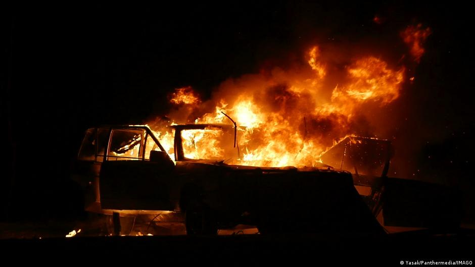 Perhaps the most versatile example of content recycling involves footage of burning cars and masked figures from protests in Thessaloniki, Greece. The video was originally posted on a Greek Instagram account in November 2025, documenting protests following an anti-establishment concert by rapper Alexis Lanaras.