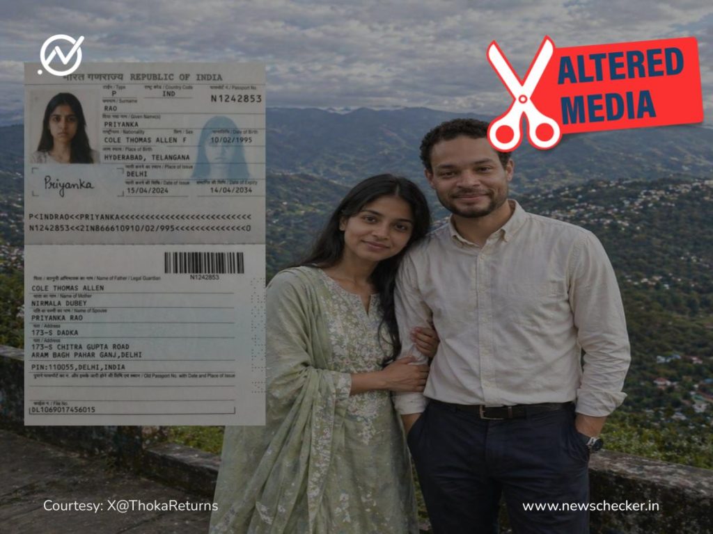Even more revealing are the glaring inconsistencies in the purported Indian passport image. The document contains numerous errors that would never appear in a legitimate government-issued identification document. These include misspellings in the Hindi text and bizarre content errors, such as listing “Cole Thomas Allen” as the holder’s nationality rather than “Indian” and repeating “Priyanka Rao” as both the passport holder’s name and spouse’s name.