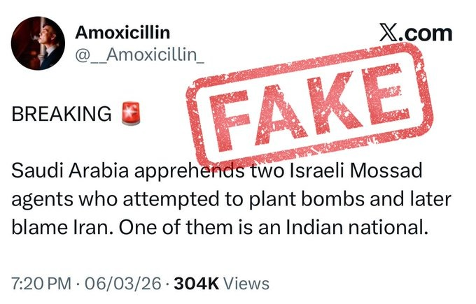 The false information, which spread rapidly across the platform X (formerly Twitter), claimed Saudi officials had arrested two Mossad-linked agents, including an Indian citizen. According to the fabricated report, the individuals were allegedly plotting bomb attacks designed to implicate Iran.