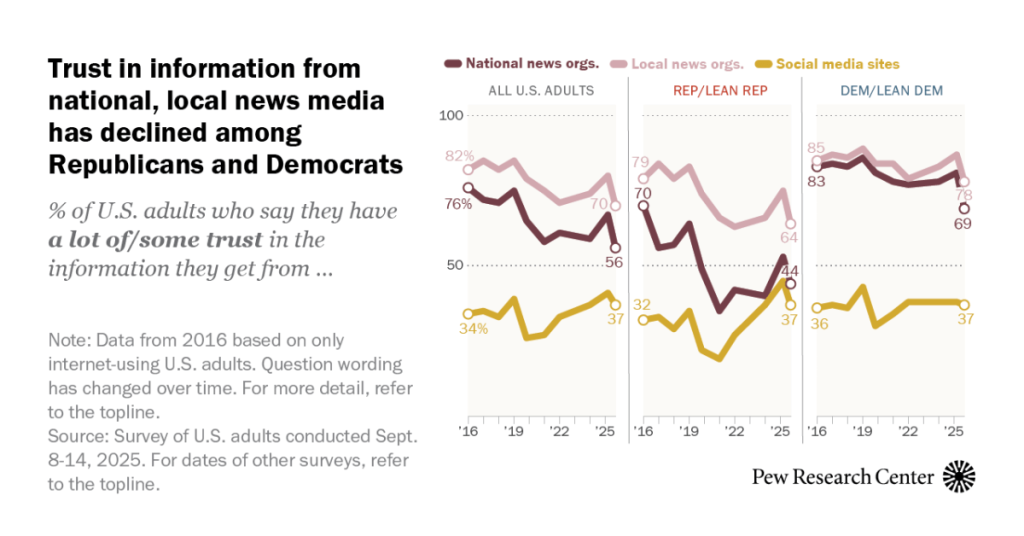 The survey, which polled 5,195 U.S. adults in September, reveals that just 56% of Americans now say they have “a lot” or “some” trust in information from national news organizations. This represents an 11-percentage point drop since March 2025 and a substantial 20-point decline since Pew began tracking this metric in 2016.