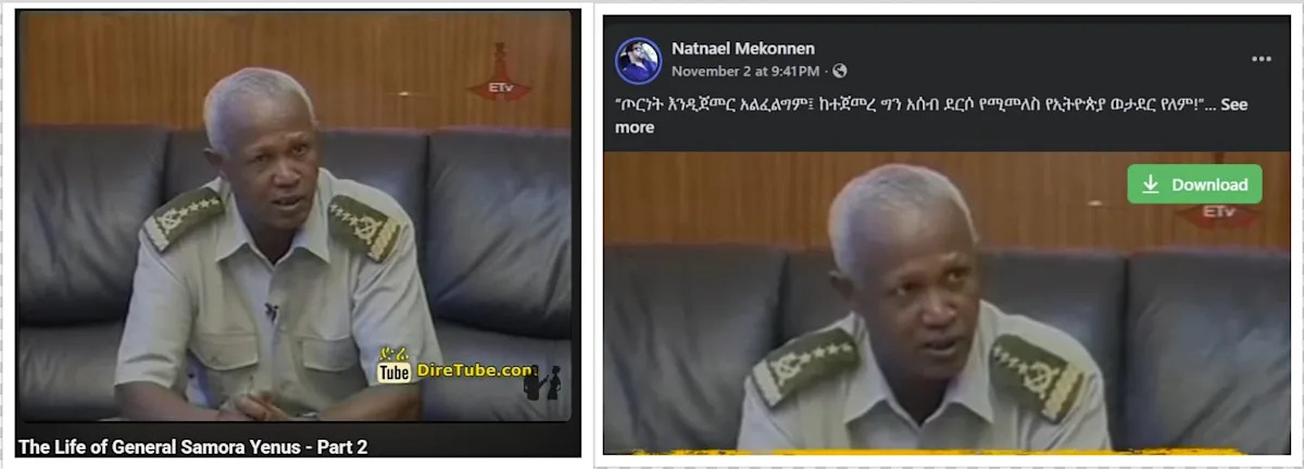 The misleading Facebook post from November 2, 2025, features footage of Samora with a fabricated voiceover claiming he stated: “I do not want the war to begin. If the war starts, the Ethiopian army’s operation will not be limited to occupying Assab.” The post attributes these aggressive statements to Samora, who served as Ethiopia’s army chief from 2001 to 2018.