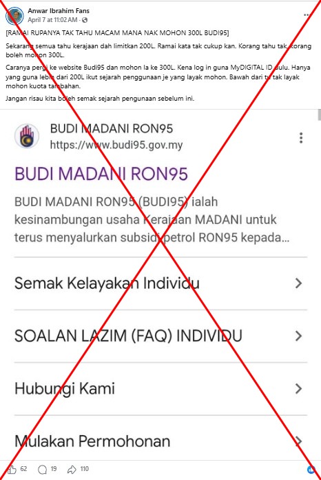 False claims circulating on social media platforms suggest that Malaysian citizens can apply to increase their quota for subsidized fuel under the Budi95 scheme, while others erroneously state that Singapore citizens have become eligible for Malaysia’s petrol subsidies.