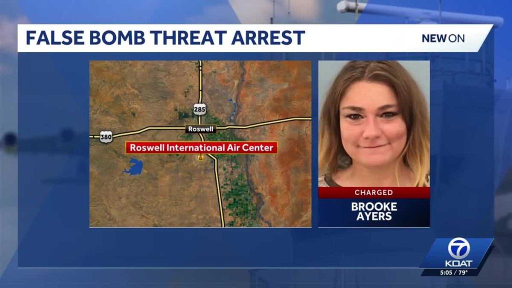 The incident began when 47-year-old Brooke Ayers contacted American Airlines Wednesday morning with claims about her ex-boyfriend, who was scheduled to depart on a flight from Roswell Air Center that afternoon. The U.S. Transportation Security Administration notified the Roswell Police Department (RPD) about the call at approximately 8:45 a.m.