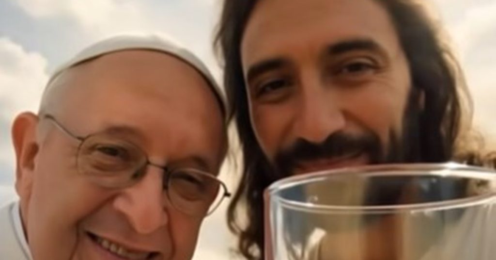In early 2025, shortly after Pope Francis’s death, a TikTok video showing the Pope performing miracles with Jesus garnered over 26 million views. The minute-long clip featured the pontiff turning water into wine before soaring through cloud-filled skies alongside a suspiciously European-looking Jesus, accompanied by Bob Dylan’s “Knockin’ on Heaven’s Door.” Though clearly labeled as AI-generated, the video exemplifies the growing phenomenon of AI-created religious content flooding social media platforms.