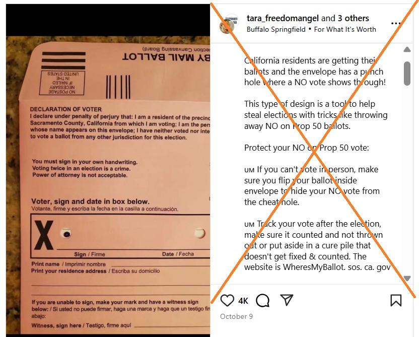 “California residents are getting their ballots and the envelope has a punch hole where a NO vote shows through!” claimed an October 9 Instagram post that gained significant traction. “This type of design is a tool to help steal elections with tricks like throwing away NO on Prop 50 ballots.”