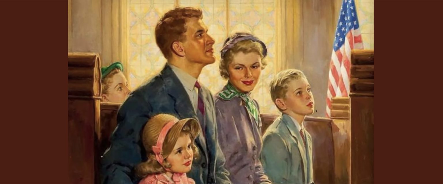 The Department of Labor’s recent campaign for “Project Firewall” features Norman Rockwell-inspired imagery that prominently displays white Christian families in idealized settings. One poster shows a white family sitting together on a church pew with the caption “A Dream Worth Fighting For.” Another depicts a white couple with two children gazing at a suburban home with a white-steepled church, school, and factory in the background, captioned with a message about the department’s mission to “RESTORE THE AMERICAN DREAM.”