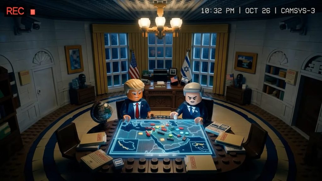 The transformation is starkly visible in a series of AI-generated videos circulating on social media platforms connected to Iranian networks. At first glance, they appear almost childish—yellow Lego-style figures, blocky missiles, and cartoonish explosions. One video features a Lego-fied Donald Trump with exaggerated hair, pacing anxiously before scenes shift to explosions and Iranian victory graphics.