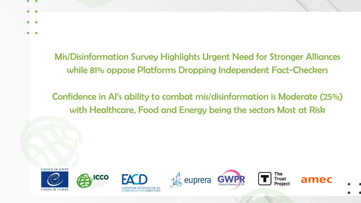 “Our 2025 survey shows an increase in disinformation according to respondents’ daily work experiences along with a moderate confidence in AI’s ability to combat mis/disinformation,” said Massimo Moriconi, ICCO Global VP and Chair of the Mis/Disinformation Working Group. “In this context, professionals call for stronger alliances among different stakeholders of the information society.”