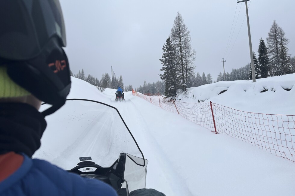 The hour-long excursions begin with an Uber transfer bus that carries up to eight participants from Cortina to the snowmobile departure point. From there, instructors lead riders along a 7-kilometer snow-covered route that reaches speeds of up to 40 kilometers per hour while winding through forest landscapes where deer and wolves are occasionally spotted.